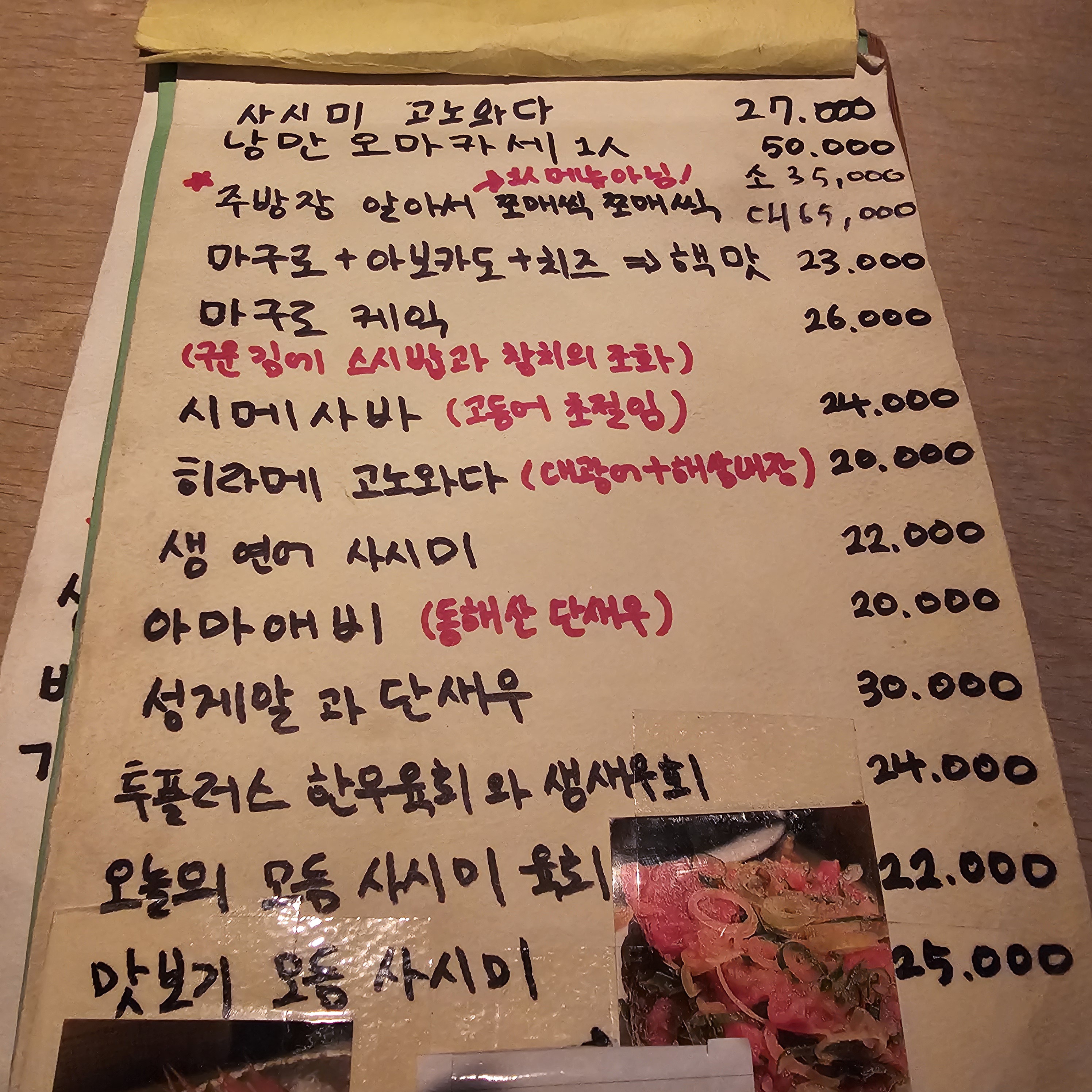 메뉴판은 이렇습니다. '주방장 알아서 쪼매씩 쪼매씩'이 오마카세인데 소짜(2인)에 인당 3만 5천원이 아니고 총 3만5천원입니다. 그나마 있는 양심으로 하이볼과 맥주 추가로 팔아드렸음.