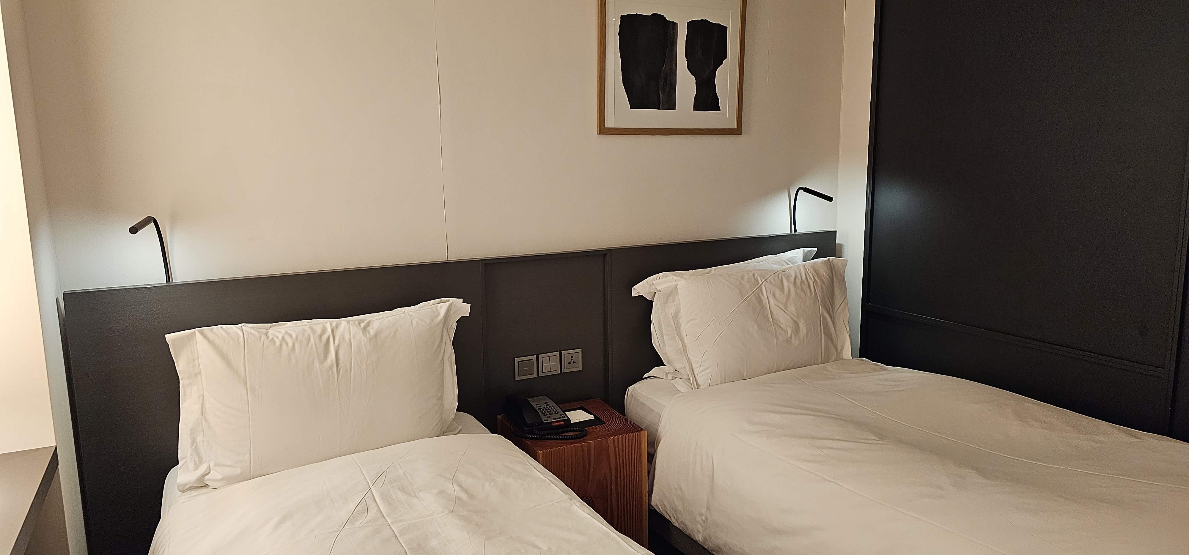 최저가 예약 때리느라 트윈 침대인 거 까먹고 있다가 더블로 바꿔달랬더니 안 된다더군요. 침대는 딱 싱글사이즈입니다. 자기에 썩 편하진 않습니다.